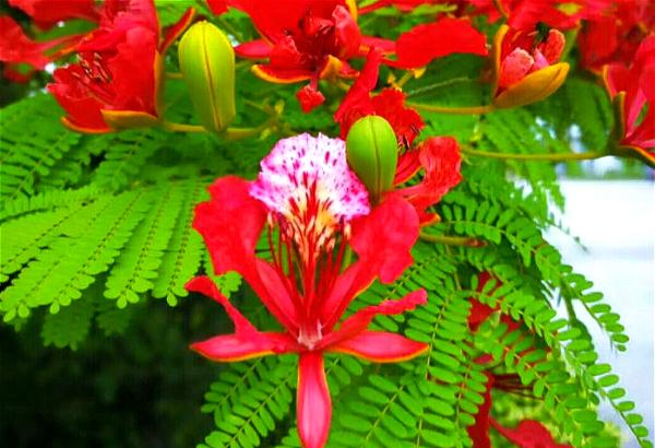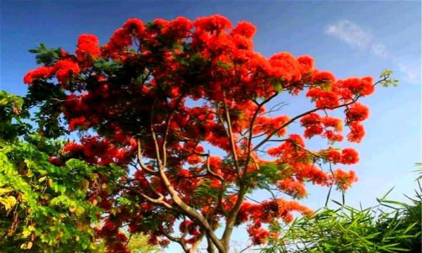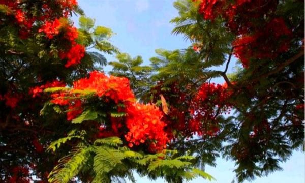 凤凰树花如其名,其花型似火红的凤冠,枝叶则形似凤凰的尾巴,树冠高大,五六月份开花就像熊熊火焰,极其壮观,不少花友都夸漂亮。广西南宁还因为种了很多凤凰树而被命名为“凤凰城”,广东汕头、福建厦门也大量种植,并将其奉为“市树”。