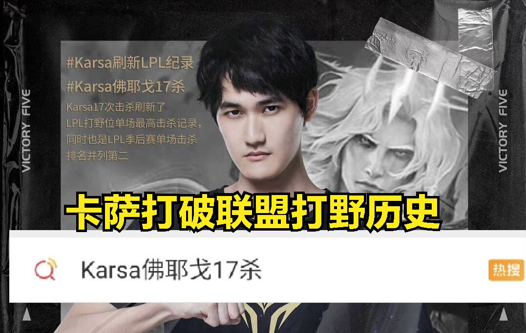 在V5赢下比赛之后,V5战队的打野选手卡萨也是打破了LPL的打野击杀记录,以单场比赛17杀的战绩成为LPL打野位置单场击杀最多的选手(上个记录的保持者是FPX的打野选手BO的16杀),虽然卡萨打破了打野位置的记录,却依然没有打破LPL单场最高击杀的选手记录。