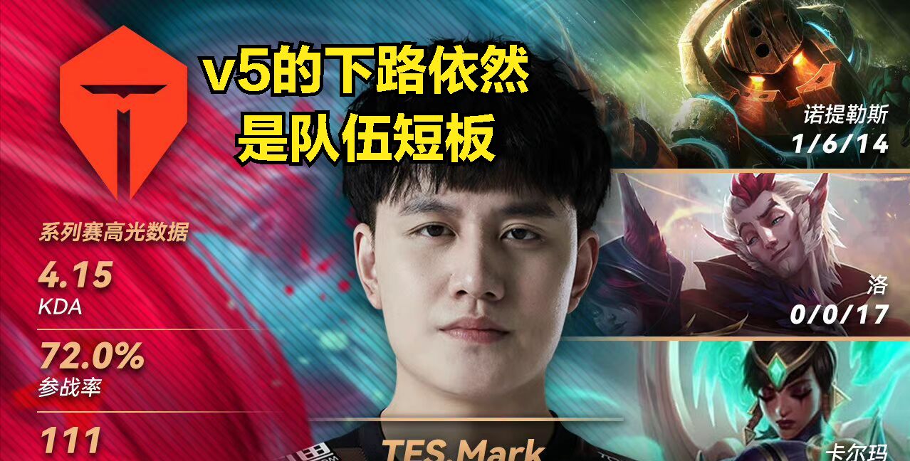 在V5成功晋级到败者组决赛后,不少的网友也在讨论V5战队是否有机会晋级到LPL决赛当中(只要打赢了TES战队和RNG战队之间的败者,那么V5就会成功晋级春决),毕竟如今V5战队的缺陷也是很明显的就是V5下路对线能力太弱和辅助状态起伏太大。(TES之所以能够让二追三V5,最大原因就是辅助差距,马克也是拿到了那场BO5的最佳选手)